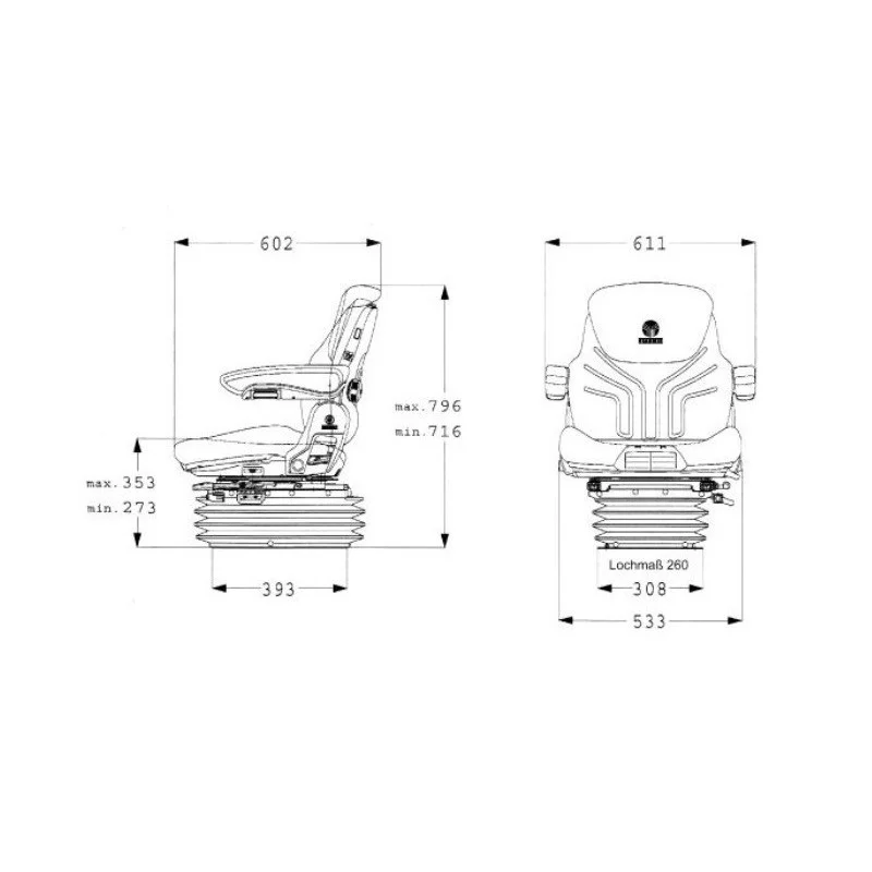 - Type de Suspension : Suspension pneumatique basse fréquence avec compresseur 12 V intégré, permettant un ajustement optimal de la fermeté du siège en fonction du poids de l'opérateur et des conditions de terrain.