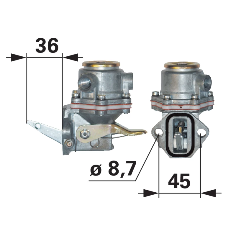 Cette pompe est conçue pour une installation facile avec une fixation à 2 trous et un entraxe de 45 mm, garantissant une compatibilité parfaite avec les moteurs Fiat/Iveco et autres systèmes de carburant. Le levier de 38 mm permet une activation efficace de la membrane, assurant un débit constant de gasoil vers le moteur.